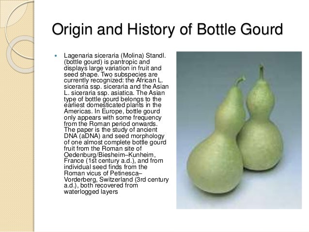 Flowers are solitary chalky white in colour and open at night. Bottle gourd is a climbing annual with a duration of 3 ½ to 4 months. It is however possible that the Romans imported them from Asia Bakels and Jacomet 2003.